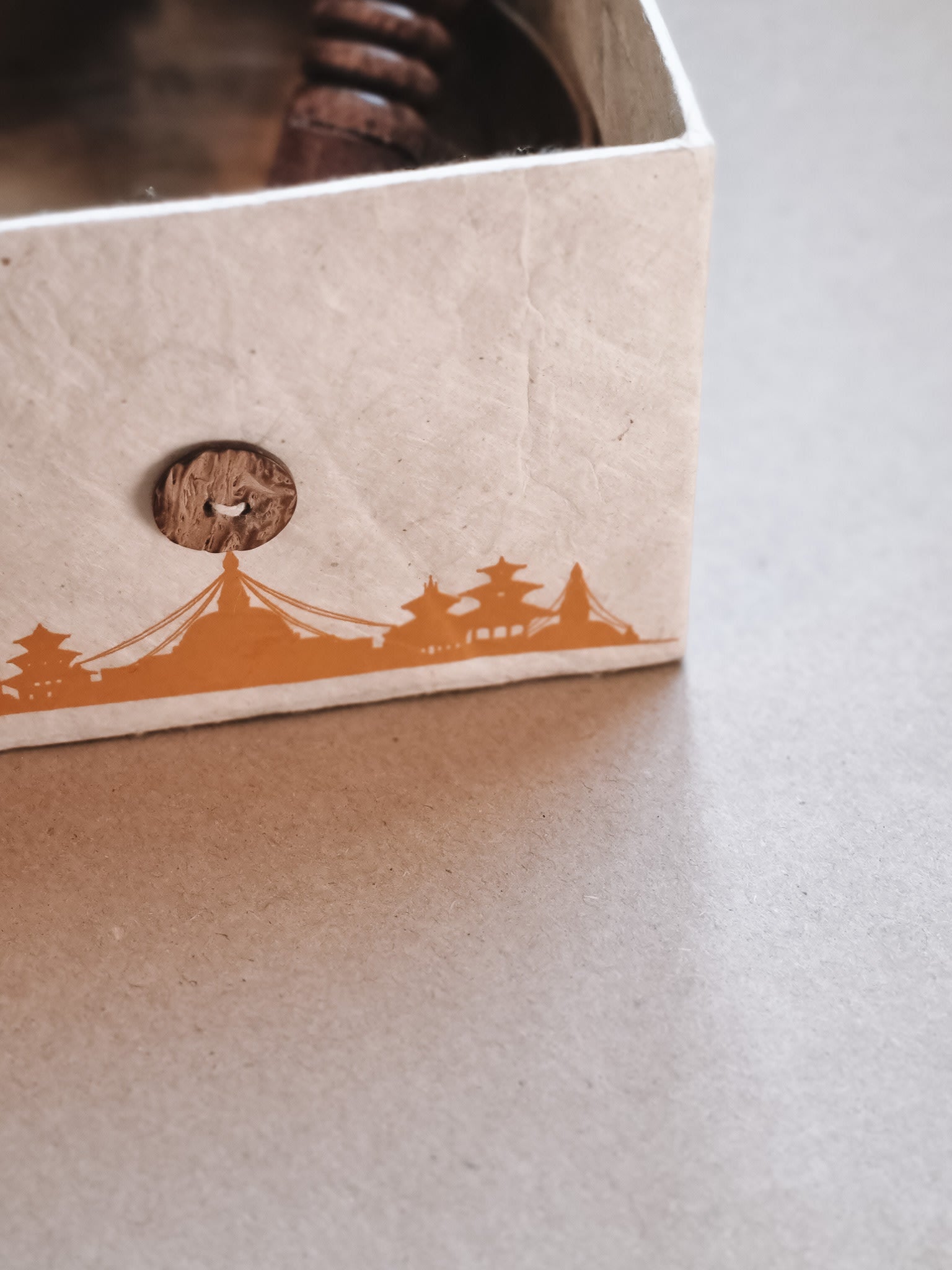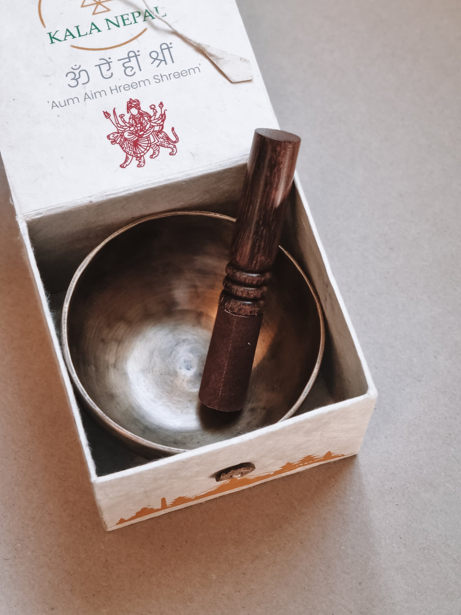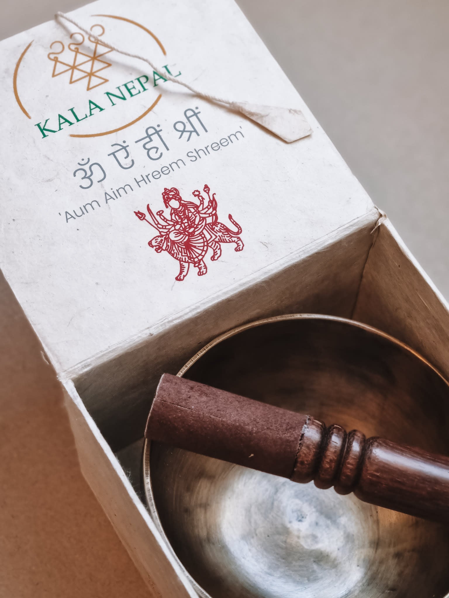 Varje skål levereras i en handgjord låda av loktapapper med det heliga mantrat ‘Om Aim Hreem Shreem’ ingraverat i locket.